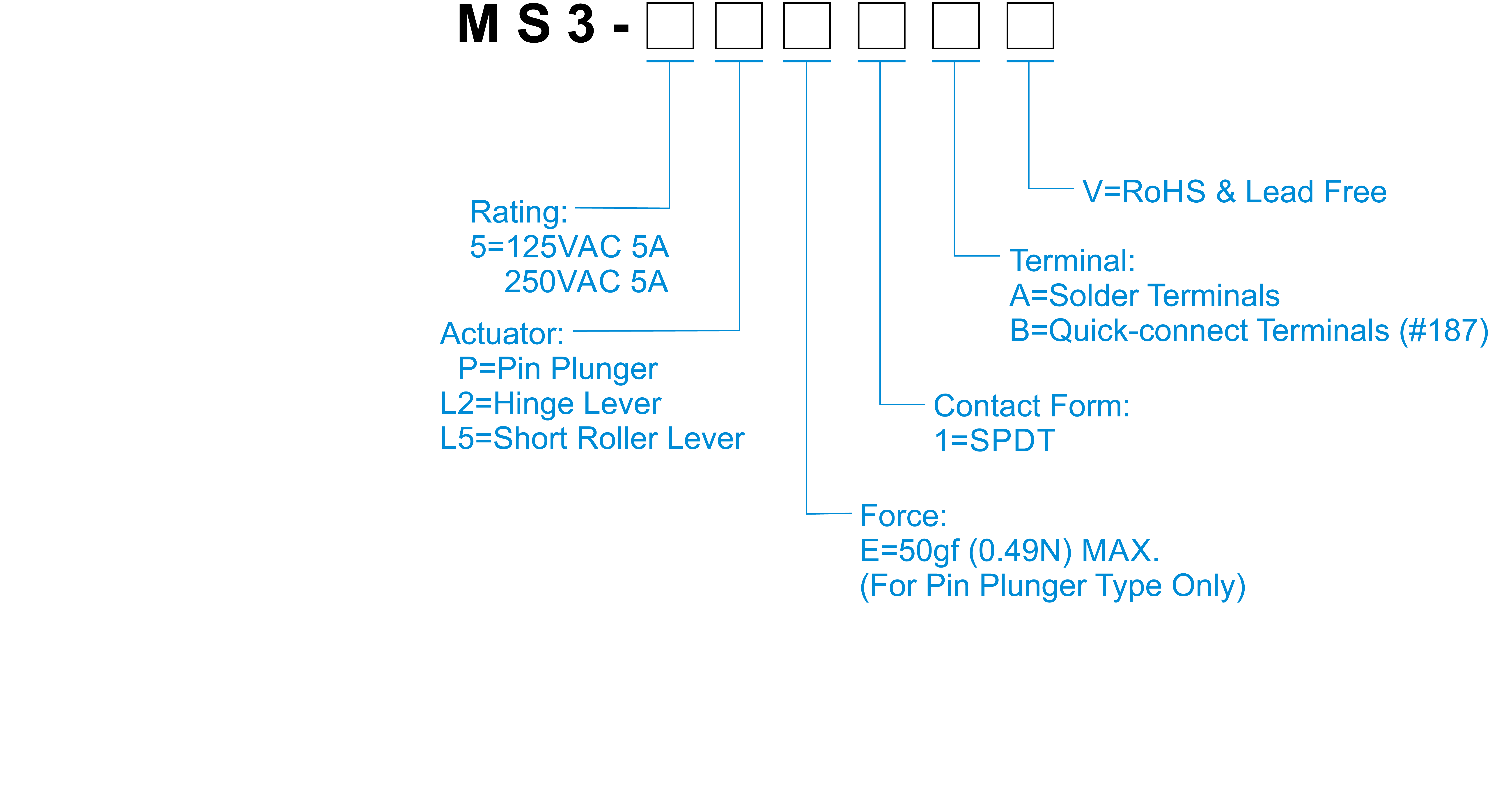 | MS3-5L2E1BV | SPDT | Quick-connect Terminals (#187) | 30 | 15.2 |